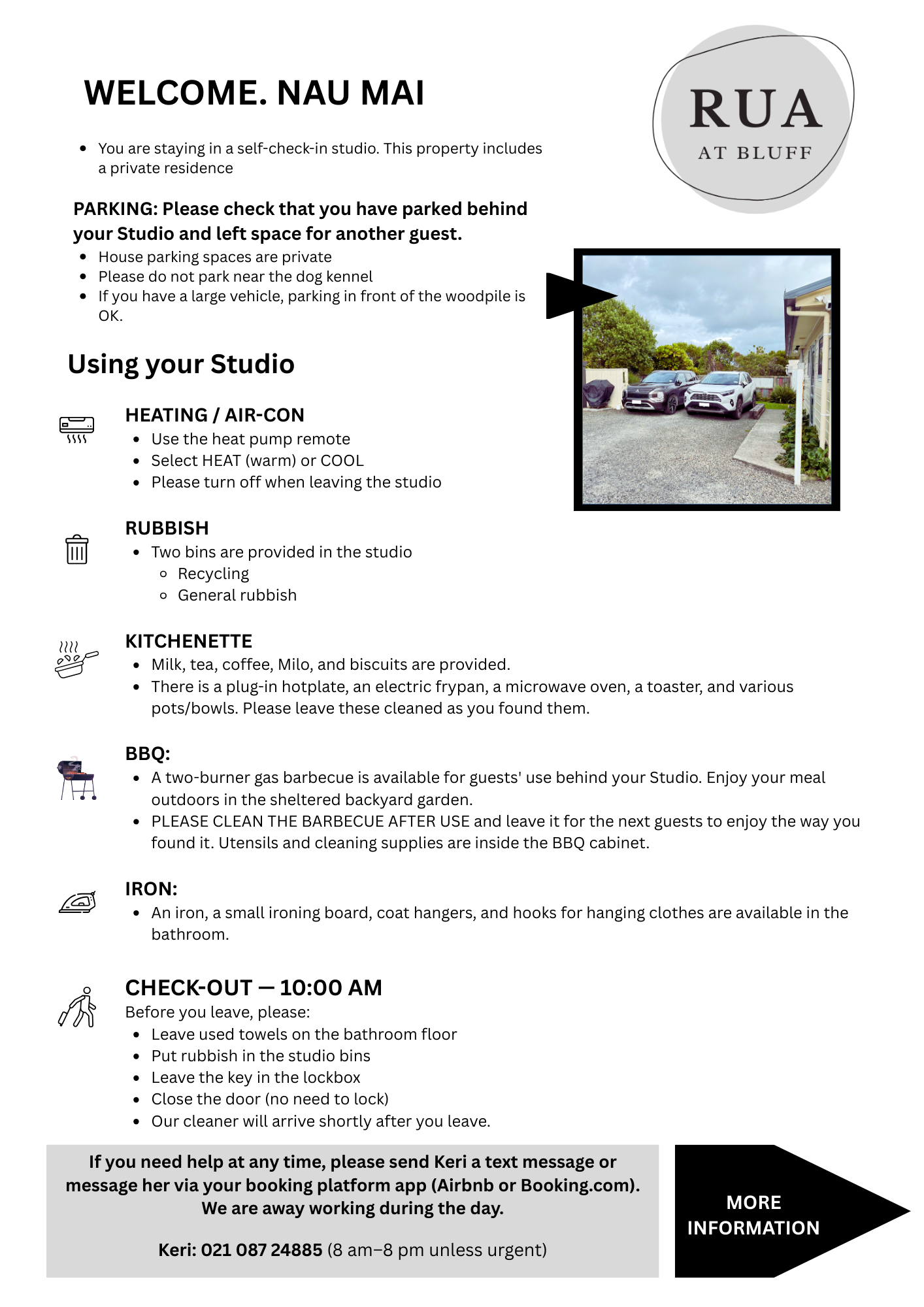 SECURITY LIGHTING: We take extra care with your security (not that we have ever had any reason to be concerned). Outdoor security lights (with video) are installed to protect your vehicle and property. These operate with motion sensors. The switch to ensure the front light works is by the ranchslider inside Studio 1. If you are a guest in Studio 1, please ensure this switch remains ON at all times. If you are a guest in Studio 2 and find the outdoor lights are not working, please send a text message to Keri 02108724885.
